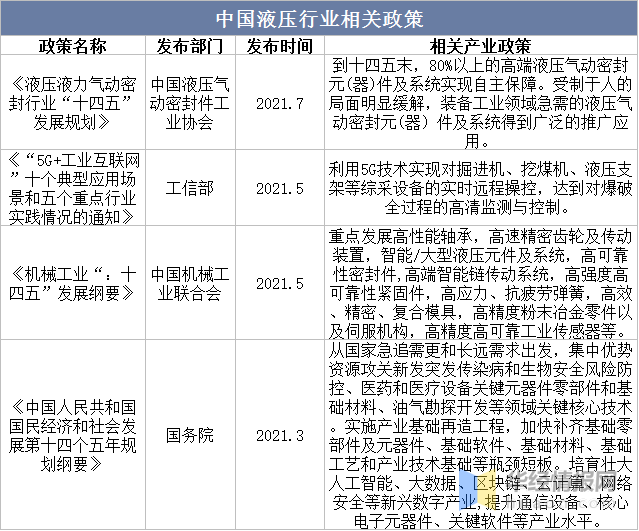 隨著中國液壓行業(yè)的發(fā)展,中國政府相繼出臺了相關(guān)政策扶持中國液壓行業(yè)繼續(xù)良好穩(wěn)定的發(fā)展,2021年7月,中國液壓氣動密封件工業(yè)協(xié)會出臺了《液壓液力氣動密封行業(yè)“十四五”發(fā)展規(guī)劃》中支出,到十四五末,80%以上的高端液壓氣動密封元(器)件及系統(tǒng)實(shí)現(xiàn)自主保障。受制于人的局面明顯緩解,裝備工業(yè)領(lǐng)域急需的液壓氣動密封元(器)件及系統(tǒng)得到廣泛的推廣應(yīng)用。
