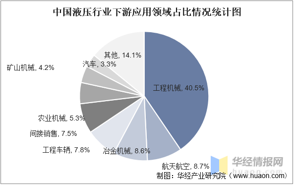 液壓核心元件廣泛應(yīng)用于各行業(yè)的各類主機(jī)產(chǎn)品和技術(shù)裝備,如農(nóng)業(yè)機(jī)械、工程建筑機(jī)械、塑料機(jī)械、機(jī)床、汽車、船舶、輕紡醫(yī)藥機(jī)械等各類主機(jī),以及航空航天、兵器裝備、冶金礦山、石油化工、電力能源、信息電子、交通車輛等重大技術(shù)裝備。中國液壓件市場的下游行業(yè)以工程機(jī)械、汽車、重型機(jī)械、機(jī)床工具為主。工程機(jī)械行業(yè)在液壓行業(yè)中的應(yīng)用占比達(dá)40.5%,是液壓產(chǎn)品最主要的應(yīng)用行業(yè)。未來隨著基建投資不斷增加,工程機(jī)械景氣度向好,液壓件需求將進(jìn)一步提升。