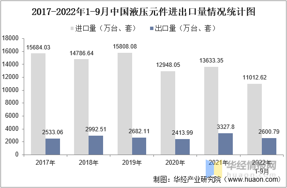 2017-2022年1-9月中國液壓元件進(jìn)出口量情況統(tǒng)計(jì)圖