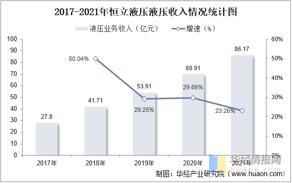 恒立液壓為中國液壓行業(yè)的龍頭企業(yè),在市場中占有一定的份額,根據(jù)數(shù)據(jù)顯示,恒立液壓液壓收入從2017年至2021年持續(xù)上漲,2021年液壓收入為86.17億元,同比2020年上漲23.26%,未來隨著中國液壓行業(yè)的發(fā)展,市場份額逐漸流向重點(diǎn)企業(yè),恒立液壓液壓收入還會持續(xù)增長。